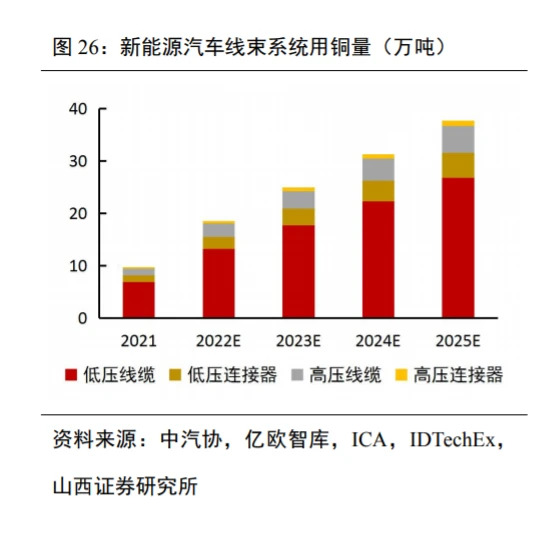 根据中汽协与亿欧智库数据,我?021-2025年新能源汽车销量分别为352万辆?70 万辆?00 万辆?130 万辆?359 万辆?根据 ICA 数据,传统汽车内燃机(ICE)用?23kg,混合电动汽车(HEV)用?40kg,插电混合电动汽车(PHEV)用?60kg,纯电动汽车(BEV)用?83kg,混合电动公交车(Ebus HEV)用?89kg,纯电动公交车(Ebus BEV)根据电池容量大小用铜量位于224-369kg 区间;我们采?BEV 单车用铜?83kg ?行测算?根据 IDTechEx 数据,新能源汽车用铜量中,电池占?8%,电机占?2%,高压线束占?%,低压线束占?8%,其他占?%;经测算,每辆新能源汽车低压线束用铜量为23.24kg,高压线束用铜量?.98kg?低压线束系统中,低压线缆(一般采用无氧铜丝)用铜量占比约85%,低压连接器(一般采用紫铜合金带材)用铜量占比约15%;高压线束系统中,高压线缆(一般采用退火纯铜)用铜量占比约75%,高压连接器(一般采用黄铜、磷青铜、铍青铜等铜合金)用铜量占比?5%;经测算,单车低压线缆用铜量?9.75kg,单车低压连接器用铜量约3.49kg,单车高压线缆用铜量?.74kg,单车高压连接器用铜量约0.75kg?根据百川盈孚数据,无氧铜丝软线、紫铜带、紫铜棒、磷铜合金、铍铜合金的2021年均价分别为6.94万元/吨?.62万元/吨?.43万元吨?.21万元/吨?6.68万元/吨?经测算,我国高压连接器用高端铜合?022-2025年需求量?.50/0.68/0.85/1.02万吨?022-2025年我国新能源汽车线束系统用铜市场规模分别?37/184/230/277亿元?/p>